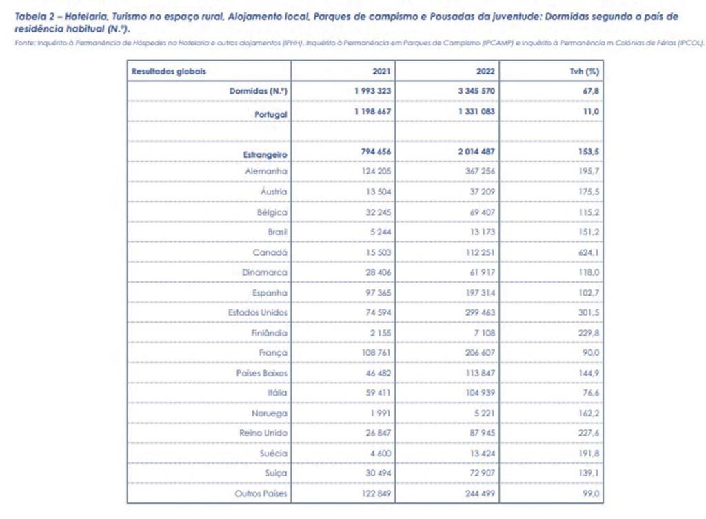 The Portuguese national market (including the regional market) guaranteed 1.3 million overnight stays, corresponding to 39.8% of the total, which grew by 67.8% compared to the previous year (10.7% compared to 2019). Overnight stays from external markets were 2.0 million (60.2% of the total) and increased by 153.5% compared to 2021 and by 12.0% compared to 2019. Looking at the external markets, Germany remained the primary inbound market, with 367.3 thousand overnight stays (18.2% of the total overnight stays of residents abroad), having increased by 195.7% from the previous year compared to the previous year (1.4% compared to 2019), followed by the North American market with 299.5 thousand overnight stays (14.9% of the total), with a growth of 301.5% compared to the previous year (2.1% compared to 2019). The third most relevant source market was the French, with 206.6 thousand overnight stays (10.3% of the total), which increased by 90.0% compared to the previous year(31.8% compared to 2019).
