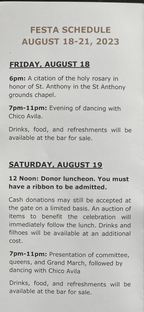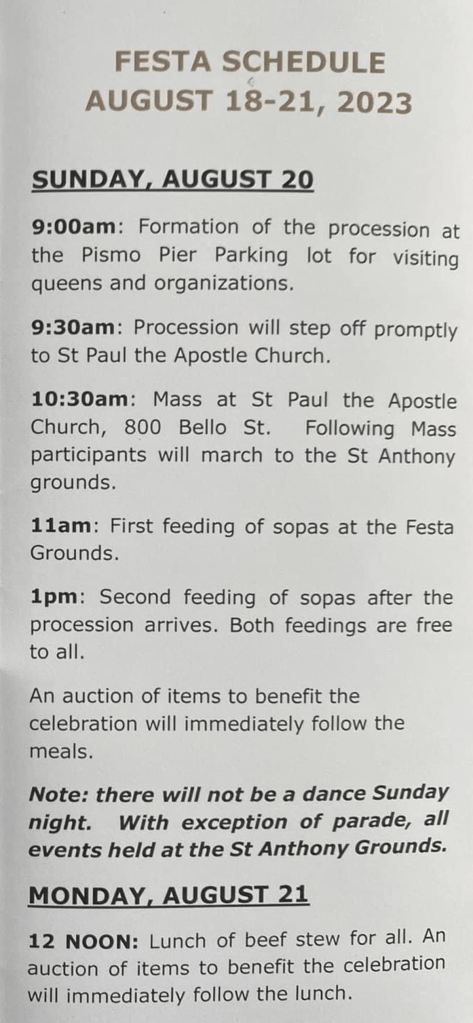 A big shout out to all who work diligently every year to put forth one of our largest Festas in California, bringing thousands to the small beach community of Pismo. as a community outreach program the Portuguese Beyond Borders Institute (PBBI) from Fresno State, publishes the program as well as the pictures of the senior and junior queens and their attendants.