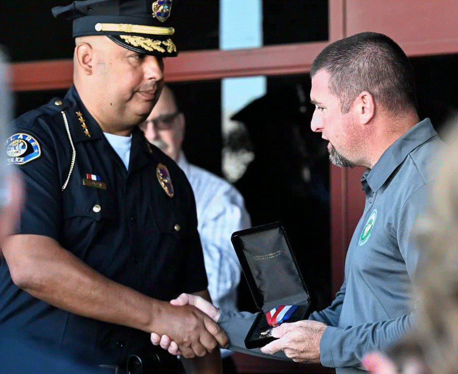 Tulare Police Chief Fred Ynclan presents Michael Capote with the Employee of the Year Award on Wednesday, September 13, 2023, during a ceremonial inspection. It is the one day out of the year that the entire police department comes together, lines up in formation, and is inspected by the Chief and members of the Command Staff.