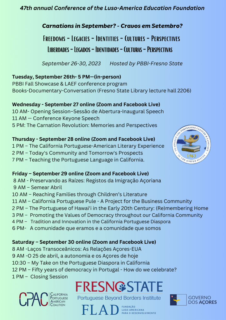 From September 27 to 30, with the theme: Carnations in September? – Freedoms, Legacies, Cultures, Identities and Perspectives, the conference with themes centered around April 25, 50 years of freedom in Portugal and its implications on the Diaspora in California. The Diaspora of half a century ago and the Diaspora of today in the state with the most significant number of Portuguese descendants in the USA, around 350,000, according to the latest US census.