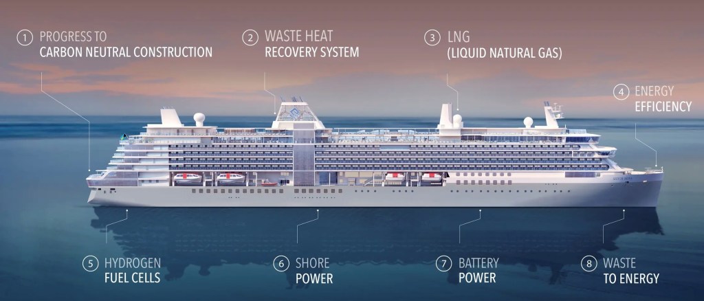 In terms of the fuel used, in this case, Liquefied Natural Gas (LNG) is a cleaner-burning fuel, as LNG-powered propulsion systems emit less CO₂ and 97% fewer particles than the standard fuel oil used in older ships.