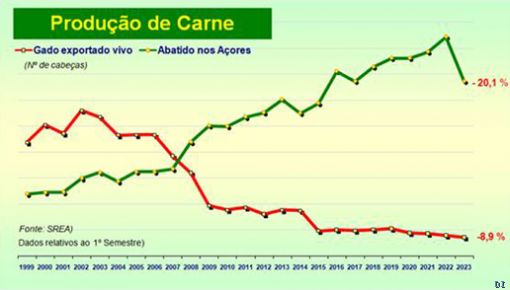 In the first six months of this year, there was a significant drop in meat production in the Azores, with a 20% decrease in slaughter in the Azorean abattoirs and 8.9% less in live cattle exports.