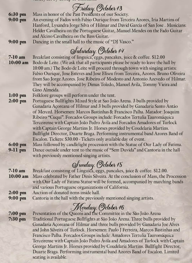 The annual festa in honor of Our Lady of Fatima happens this weekend in Thornton. Here is the program and a bit about this tiny community in San Joaquim County that will be visited by thousands of Californians with roots in the Azores this weekend.