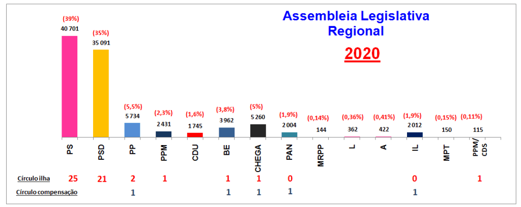 The graph above shows the number of seats in the Azorean Parliament from the prior elections in 2020