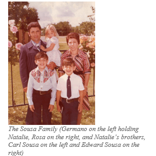 Natalie Sousa is a first-generation Portuguese American born in Tulare, California. Her two parents, Germano Sousa and Rosa Sousa, and two of her older brothers, António Alberto Sousa and Carl Sousa, lived on the island of São Jorge before moving to the United States of America. Seeking the land of opportunity and the chance to obtain a better financial situation, in October of 1968, her family flew from the Azores to San Francisco, California. Once landed in San Francisco, Germano and Rosa headed to Tipton, California, where they could find work on a dairy and the first step towards a better financial future for the family.