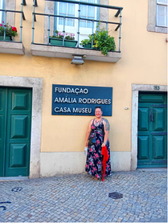 It was a journey to get to her home that day,, and we ended up making it late to our scheduled tour ~ but it all worked out, since they started late that session. The tour begins in her living room, which was an absolute SURREAL feeling within Amália’s home’s walls. What a legend and what love I have for her. I was pretty much instantly emotional and tried to keep my composure as everyone else on the tour. That was a difficult task! A few minutes into it, my mind starts playing tricks on me, and it feels like someone tapping their 3 fingers on my shoulder, near the piano. I turn around, and no one is there. Did that just happen? Unsure, but definitely shook me up! I could hear “Chico” already in the kitchen nearby. I look at my husband, with big bright, excited eyes, “Chico!”. Confused, he stared, and then I whispered, “her pet parrot!” That was literally one of my favorite parts, to go into the kitchen and have that animal study me from head to toe. He could not get his eyes off me, as if he saw the shawl, or the fringes of the shawl, and knew instantly, “what’s up” ~ Ah, Fadista ~ It was remarkable to see her hand-painted dining room (cherries and blossoms), as well as her beautiful kitchen full of different teas and tea cups (yup! Heaven for me!) Another part of the tour that I really enjoyed was her bathroom in the hallway, full of her perfumes (what a collection) and the lipsticks and nail polish she would use. I just wanted the tour to abandon me, alone in there, for a few hours… I wanted to try on all her perfumes and makeup… of course, I loved seeing her bedroom and “walk-in closet”! Loved her jewelry, sunglasses, shoes, dresses… I just wanted to be left alone in there to try on all her outfits and explore all her drawers… what a fantasy I was playing in my mind! I enjoyed seeing a case full of awards and trophies at the entrance of her room, “and much more you deserved” (I thought to myself). She was the Queen of Fado and forever will be! After the tour, we stayed for Fado in the Jardim. That was a cool experience, where they asked people to read from her book of poetry (fado). To my surprise, lots of people stood up with courage to read her Portuguese poems, some of which were from other countries and did not speak the language but it was beautiful to see them try! Trying for Amália, it was very beautiful actually.