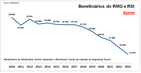 Speaking to the press, Mónica Seidi (Regional Secretary for Health) stressed that there has been a significant reduction in the number of RSI beneficiaries. The figures do not coincide with those presented in the graphs in this article because the statistics released by the government refer only to working-age citizens. In contrast, the statistics presented here refer to all beneficiaries, the data available on the Pordata statistical platform.