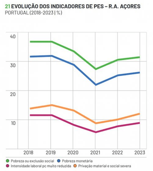 Three out of 10 Azoreans were at risk of poverty or social exclusion in 2023. According to a report by the National Observatory for Combating Poverty, released on Wednesday, with data for 2023, the Azores are the most vulnerable region in the country, with a risk of poverty or social exclusion rate of 31.4%. Since 2021, the region’s poverty indicators have gone against the downward trend observed since 2018.