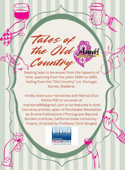 We encourage you to contribute stories from the Old Country, whether personal or familial. Our platform seeks to share these tales internationally through Amá Conversa articles, featured in Novidades Newsletter .com (The Islands & the Diaspora), an initiative of Bruma Publications & Fresno State’s Portuguese Beyond Borders Institute , directed by Professor Diniz Borges. Submit to marisarod89@gmail.com
