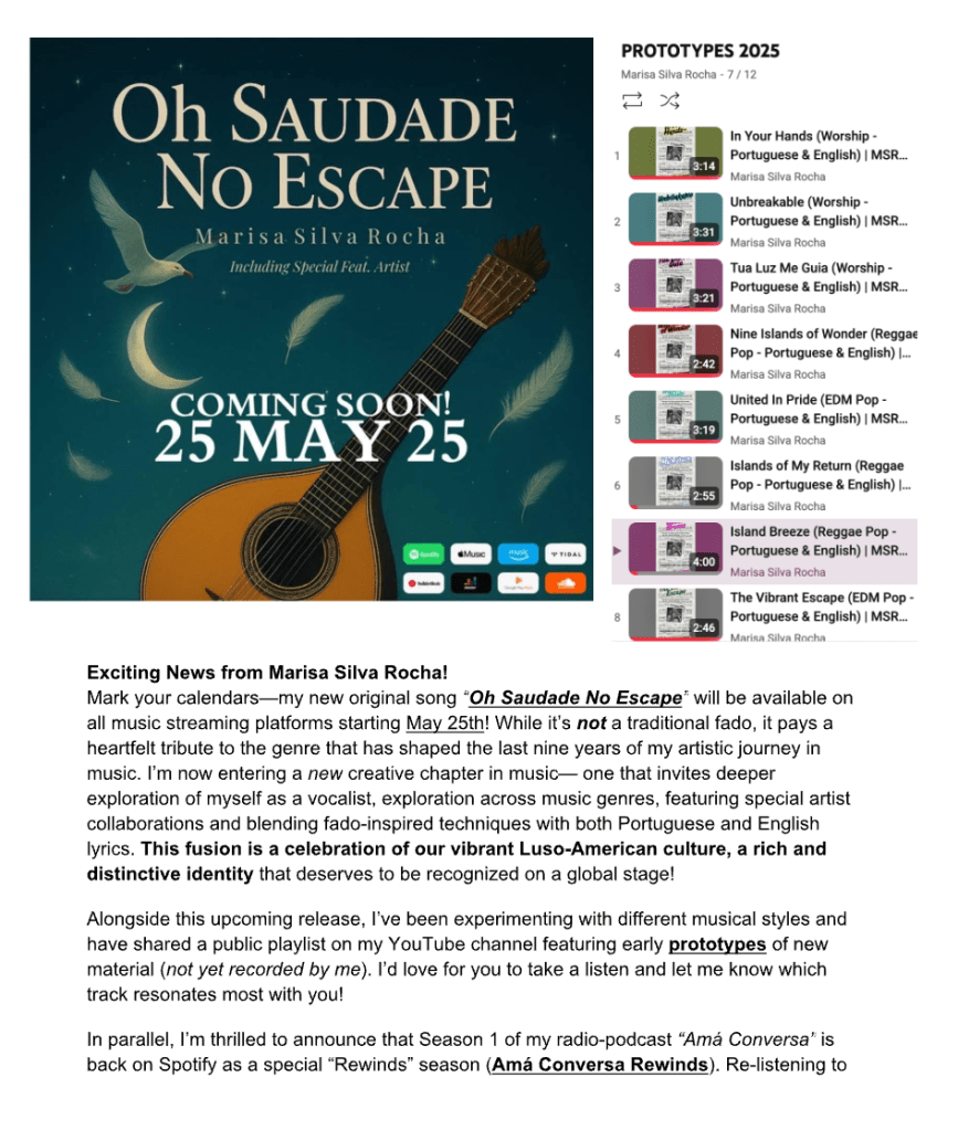 Community - Comunidade, diaspora in Califórnia - a diáspora na Caliornia AMÁ CONVERSA BY MARISA SILVA ROCHA Date: May 14, 2025Author: Diniz Borges 0 Comments NEW MUSIC ALERT! NEW PODCAST ALERT! Share this: Click to share on X (Opens in new window) X Click to share on Facebook (Opens in new window) Facebook Click to email a link to a friend (Opens in new window) Email Click to share on LinkedIn (Opens in new window) LinkedIn Click to share on Pinterest (Opens in new window) Pinterest Click to share on WhatsApp (Opens in new window) WhatsApp Like Loading... Related