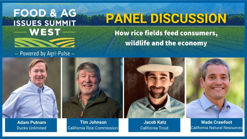 Did you know that rice production in California’s Sacramento Valley creates about $1 billion of added economic value and up to 7,500 jobs, while rice fields act as surrogate wetlands for many birds, snakes, and other wildlife? That’s just one of our topics for discussion at the Agri-Pulse Food & Ag Issues Summit in Sacramento on June 10, where we’ll hear from: