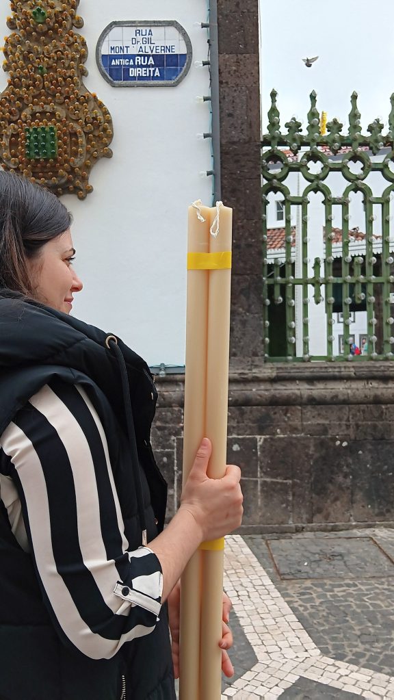 Next to the Convent of Esperança (hope), we meet Lúcia and Beatriz, mother and daughter from the parish of São Roque. Beatriz is holding two tapers, which will be used to fulfill a promise they will make today. The young woman confesses that “it’s believing that drives us”, revealing the importance of this tradition and the figure of Santo Cristo in her religious life.