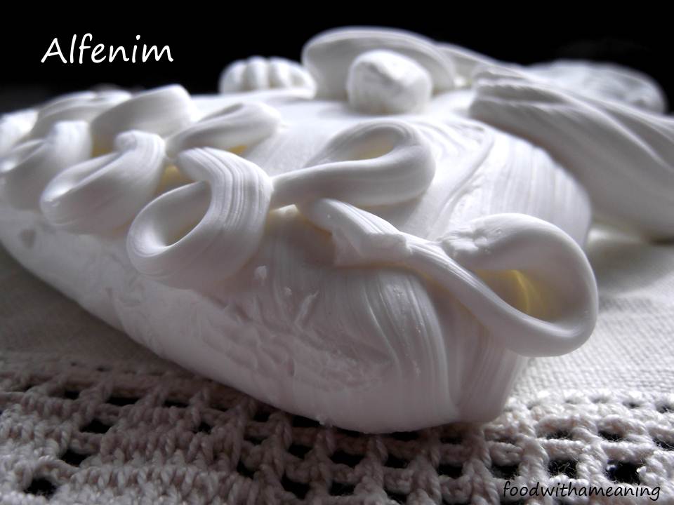 Alfenim (a word derived from the Arabic “al-fenid,” meaning “white”) is made solely from sugar, water, and vinegar; however, if it is overcooked, it transforms into a candy-like substance. Shaping it into realistic images requires a technique that is not within everyone’s reach. The mixture takes about 20 to 25 minutes to cook, and when it reaches the right consistency, it is poured into a buttered bowl, which is placed inside another bowl filled with cold water to cool the dough.