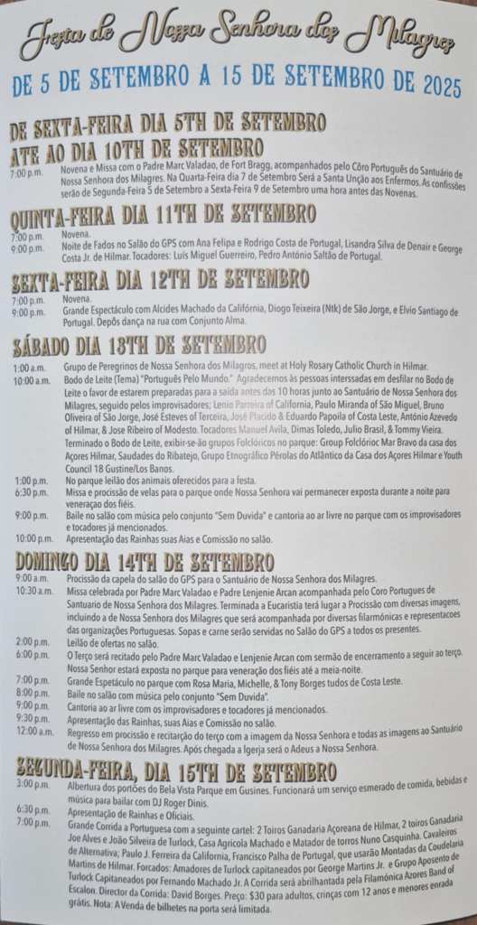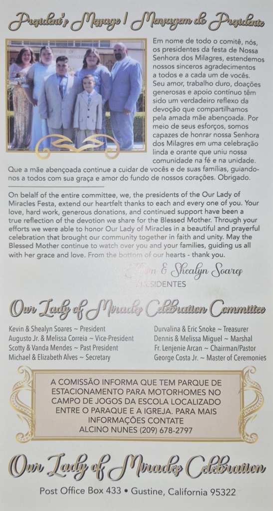 Gustine’s streets, adorned each year with banners and flowers, echo with more than hymns — they echo with the enduring dream of community. Events like this nourish the Catholic faith not only as an institution but as a living, breathing part of people’s daily, intergenerational lives. For the Azorean diaspora, Nossa Senhora dos Milagres is not only a figure of divine grace — she is the mother of the emigrant heart, the one who holds our uprootedness and grants it shelter.