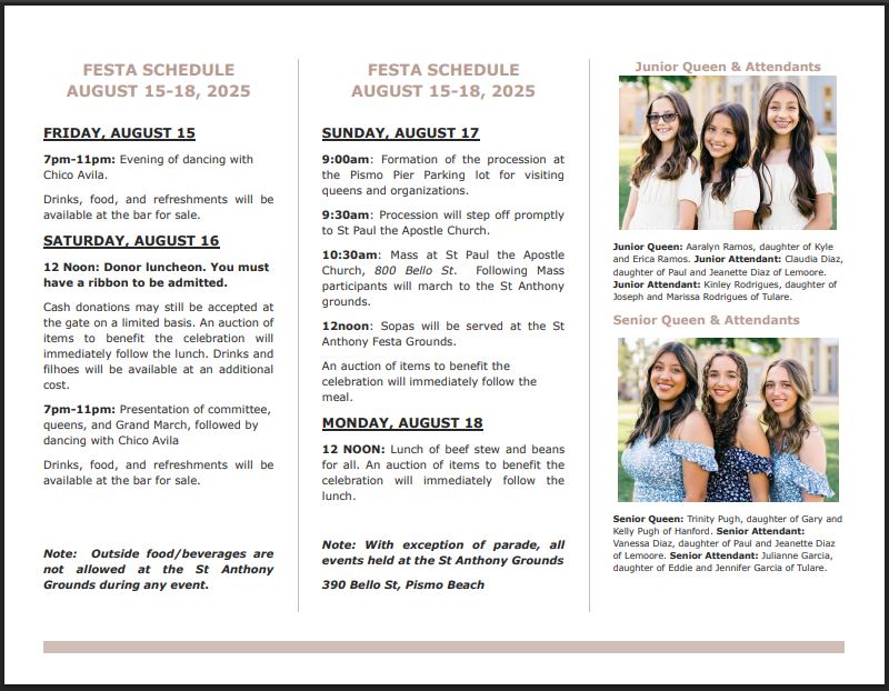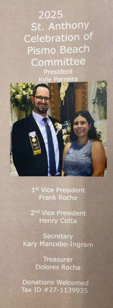 Every August, the quiet coastal charm of Pismo Beach, California, is transformed by the vibrant sounds, scents, and colors of the St. Anthony Portuguese Celebration. Rooted in the centuries-old Azorean tradition honoring Santo António, the festa is both a spiritual and cultural homecoming for Portuguese-Americans from across the Central Coast and beyond. The weekend brims with music, a parade, the aroma of sopas, the swell of marching bands, and bonding between various generations. More than a celebration, it is a bridge between past and present — a living testament to the faith, resilience, and communal spirit that Portuguese immigrants, particularly from the Azores, brought with them to California’s shores, and a promise that these traditions will continue for future generations. Here is the program and the host of officers for this year’s celebration.
