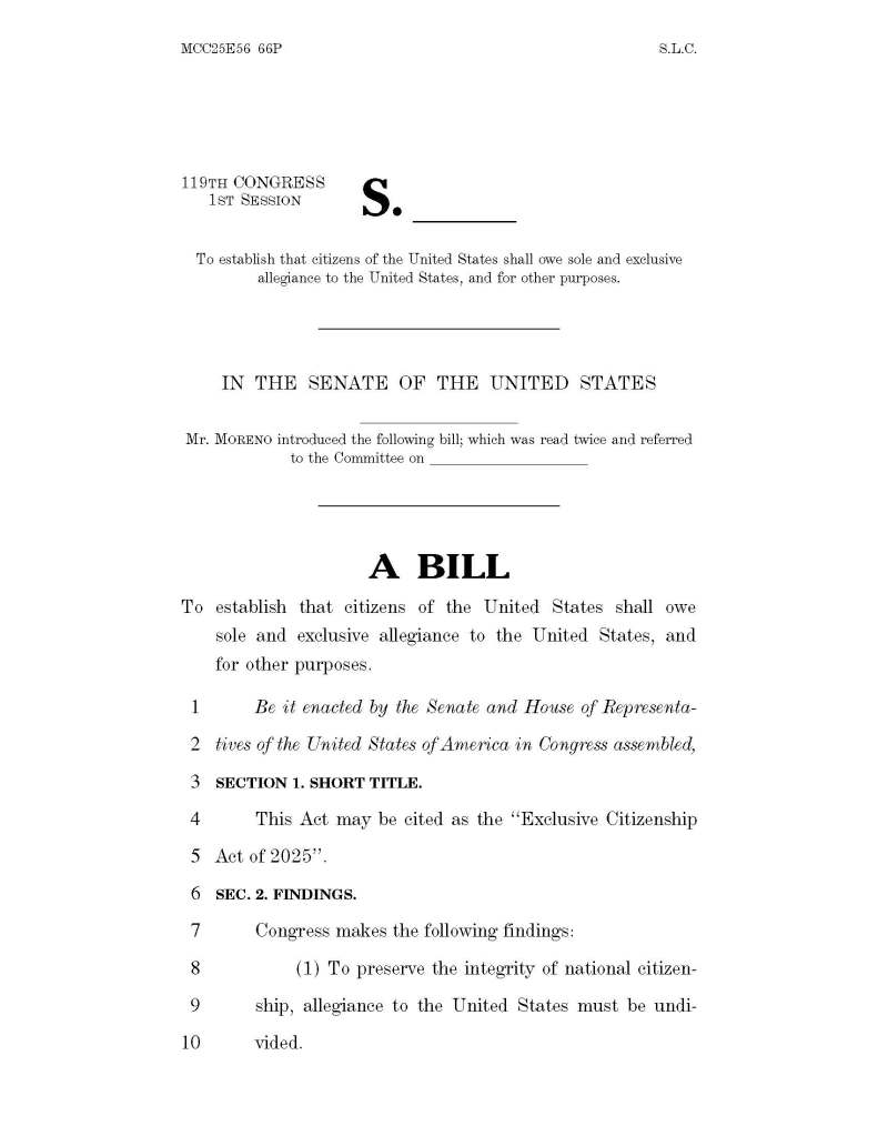 Its stated objective is “to establish that citizens of the United States shall owe sole and exclusive allegiance to the United States.” Exclusive-Citizenship-Act-of-20…