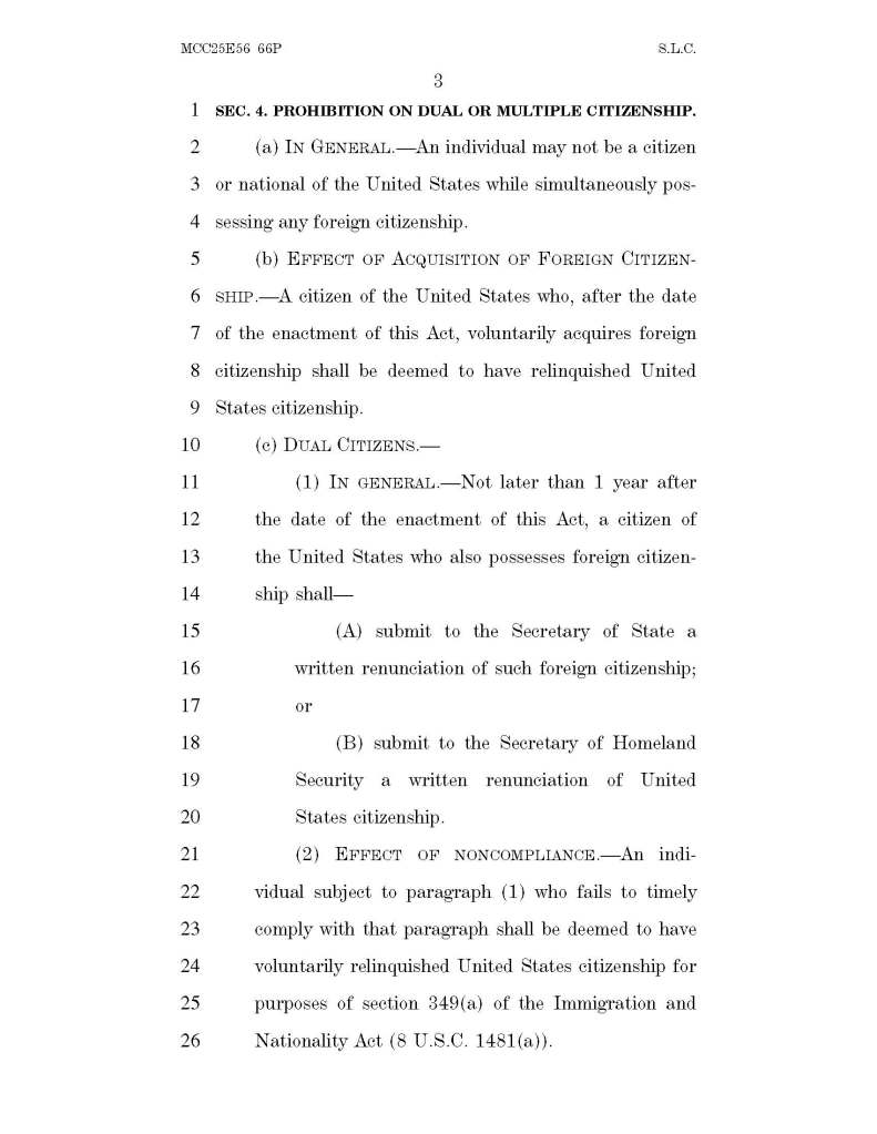 - “An individual may not be a citizen or national of the United States while simultaneously possessing any foreign citizenship.” Exclusive-Citizenship-Act-of-20…