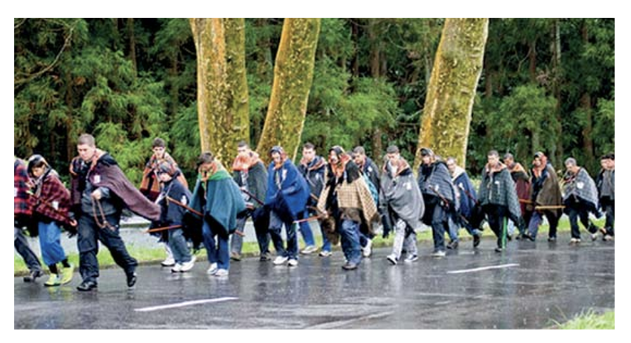 They walk wrapped in shawl and kerchief, rosary in hand, wooden staff in the other — a quiet procession of endurance against wind and salt air.